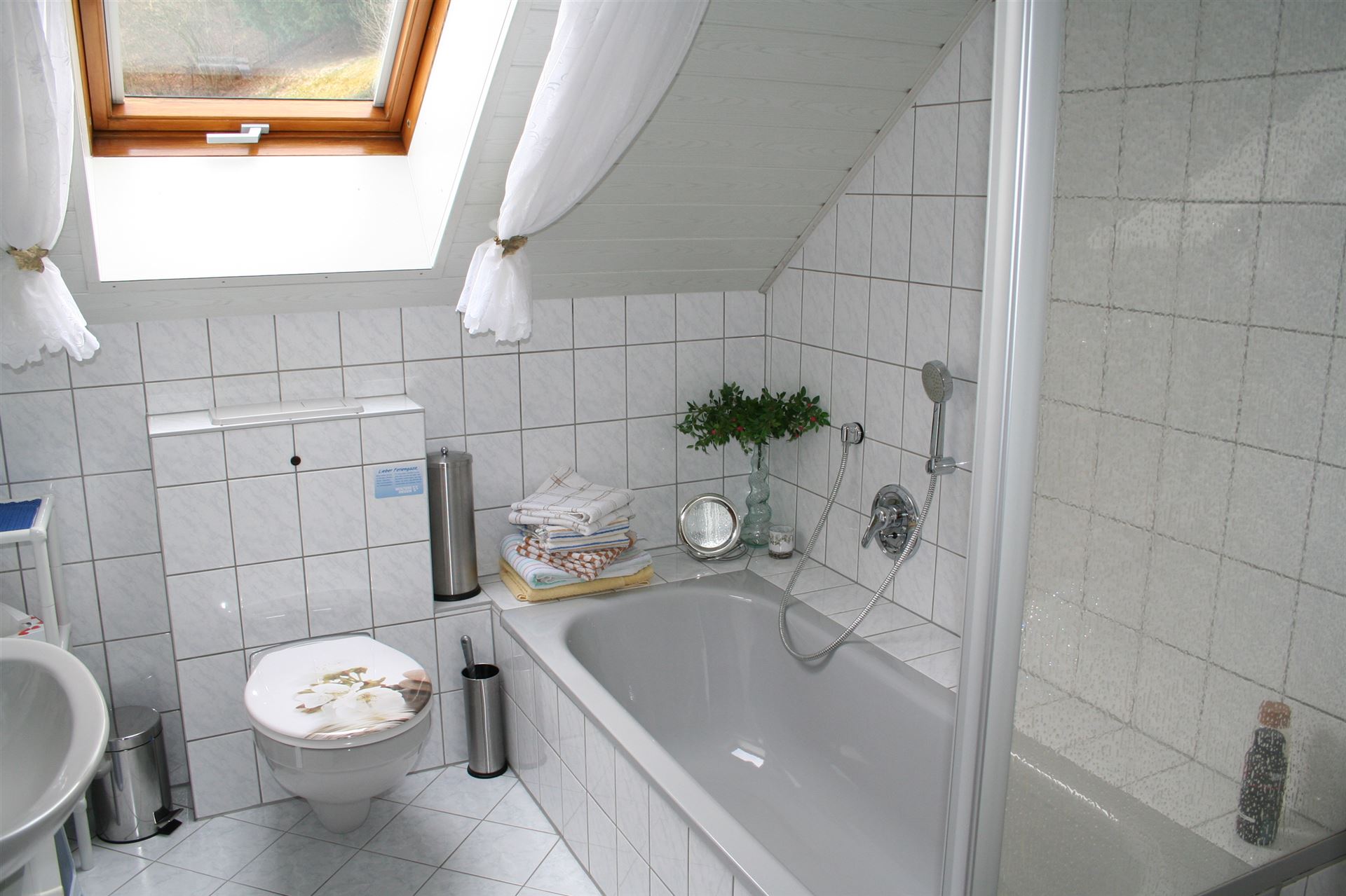 Im Bad finden Sie eine Toilette, Dusche, Badewanne und beheizten Wandhandtuchtrockner, Fön sowie genügend Ablagen. Über das Dachfenster können Sie lüften.