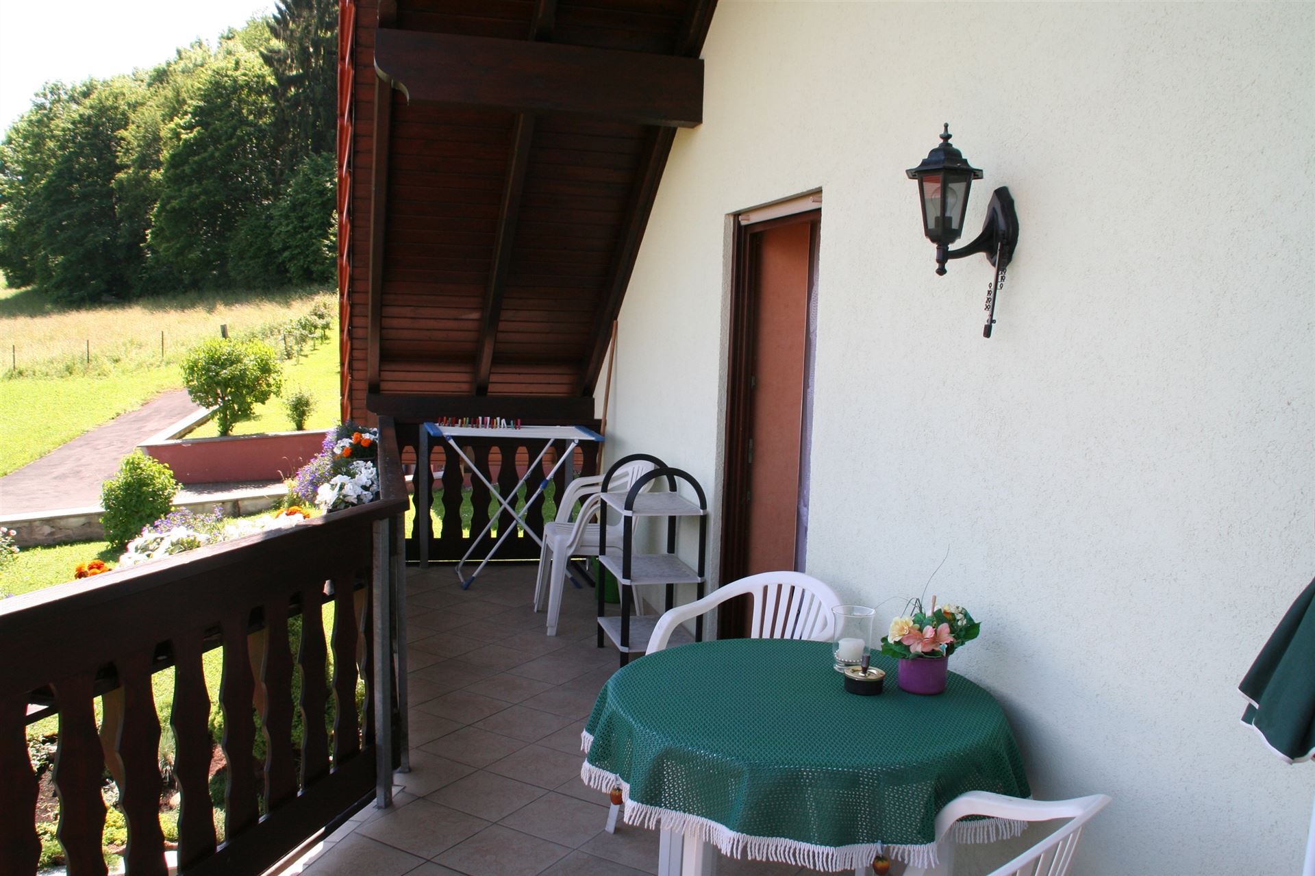 Das besondere Highlight dieser Ferienwohnung ist Ihr großer Balkon mit Sitz- und Liegemöbeln, Beleuchtung und jährlich wechselnder Bepflanzung im Sommerhalbjahr, den Sie vom Schlafzimmer aus erreichen. Hier können Sie den Ausblick zu jeder Jahreszeit genießen und dem Vogelgezwitscher zuhören. Da Sie morgens dort die aufgehende Sonne haben, bietet sich ein Frühstück an der frischen Luft an. Am späten Nachmittag können Sie nach einem langen Ausflug im Schatten die Beine hochlegen. Durch die weitreichende Überdachung werden Sie auch bei einem leichten Regen nicht nass.