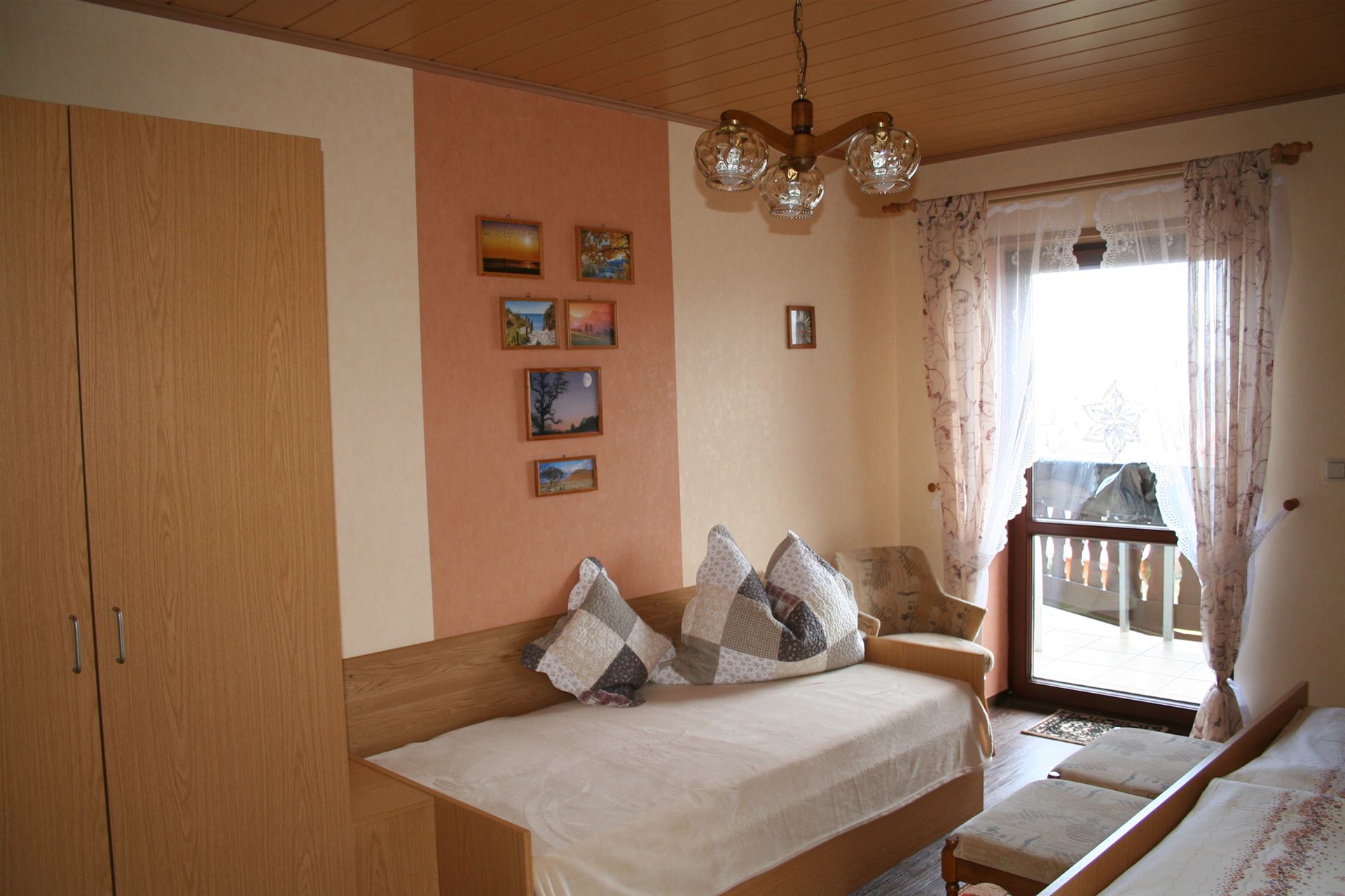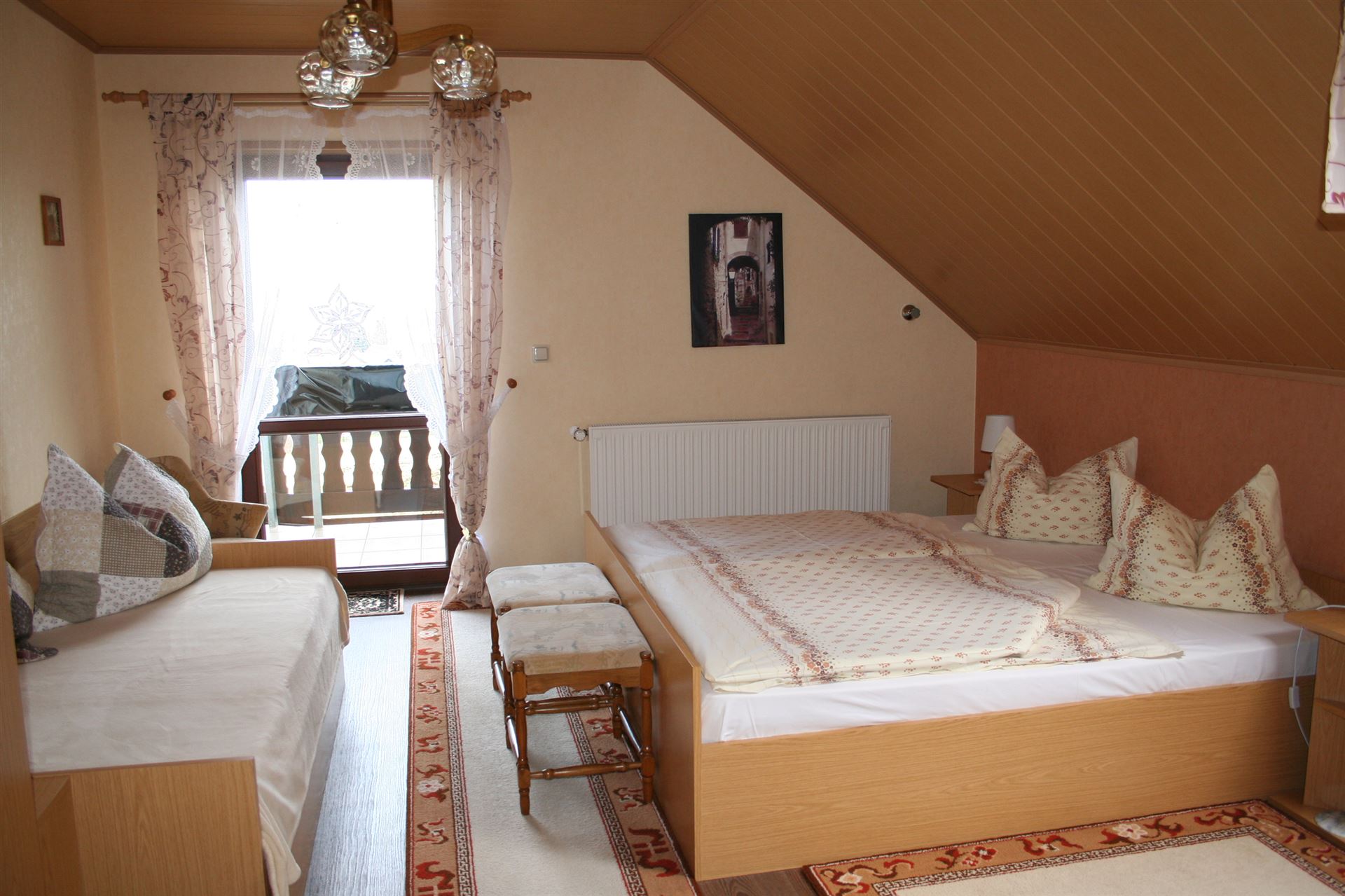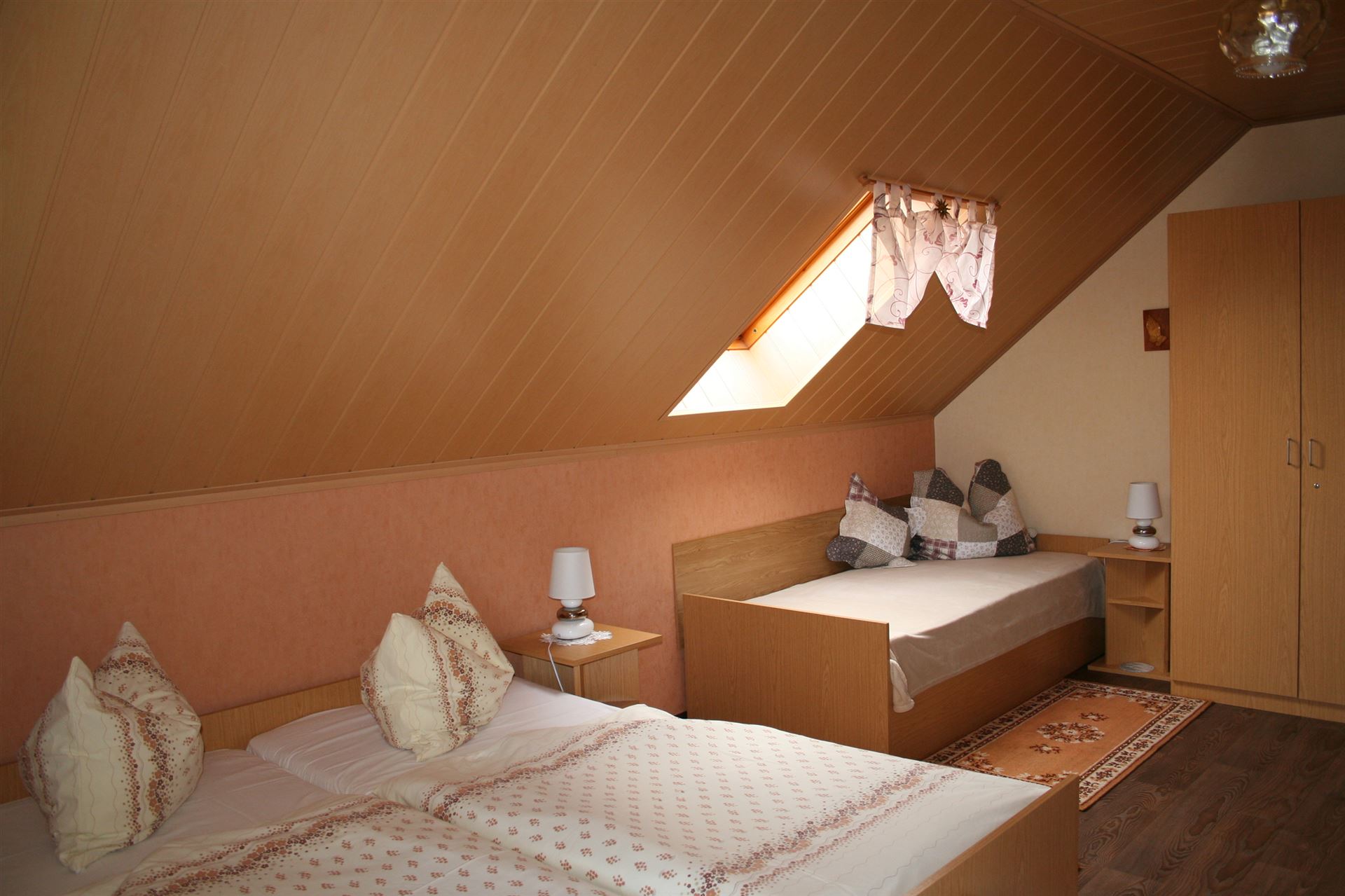 Das große Schlafzimmer bietet mit einem Doppelbett sowie zwei Einzelbetten, davon eins unter der Dachschräge, genügend Platz zum Schlafen. Zwei Kleiderschränke (einer mit Ganzkörperspiegel) und vier Sitzmöglichkeiten bzw. Kleiderablagen sind vorhanden.